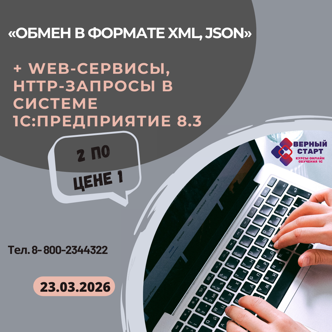 При записи на курс «Обмен в формате XML, JSON» (Тариф Оптимальный) до 23 марта 2026 г., вы получаете БЕСПЛАТНО курс «WEB-сервисы, HTTP-запросы в 1С:Предприятие 8.3» (стоимостью 4000 рублей)!