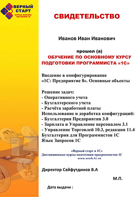 Программируй в типовых конфигурациях (Бухгалтерия Предприятия (БП), Зарплата и Управление Персоналом (ЗУП), УНФ (НОВЫЙ курс Управление Нашей Фирмой) , Управление Торговлей (УТ) . Длительность обучения от 3 до 6 месяцев.